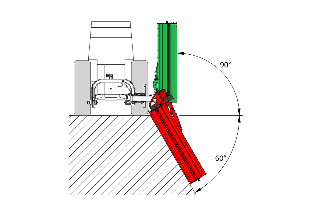 - Прочный и надежный параллелограммный механизм позволяет выполнять измельчение на поверхностях с уклоном до 90 вверх и 60 вниз позади трактора или сбоку от него. Сцепка обеспечивает плавающую подстройку под неровности поверхности.