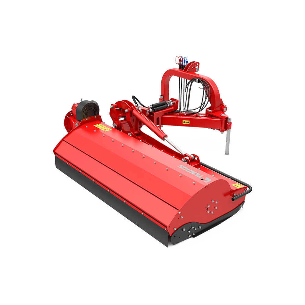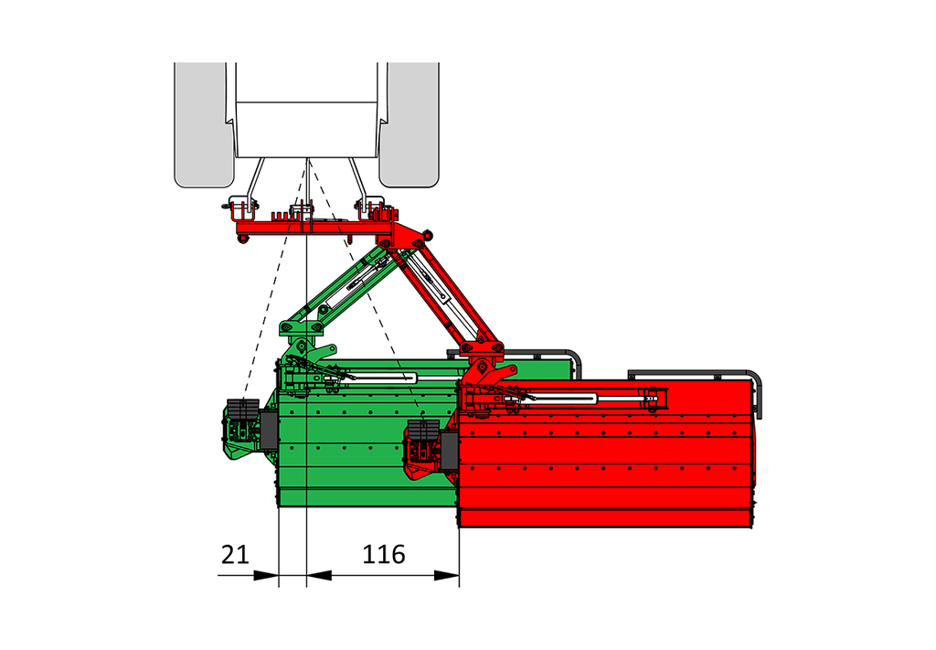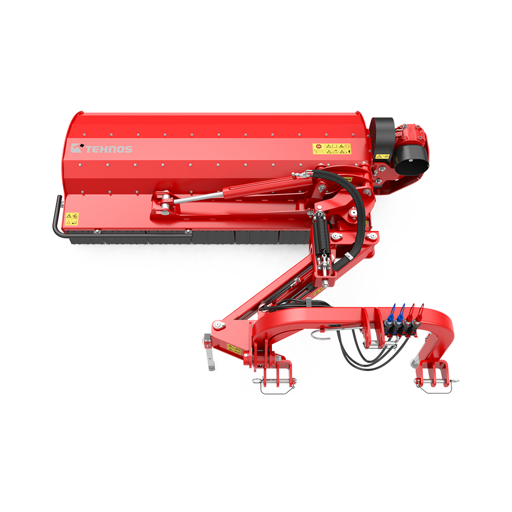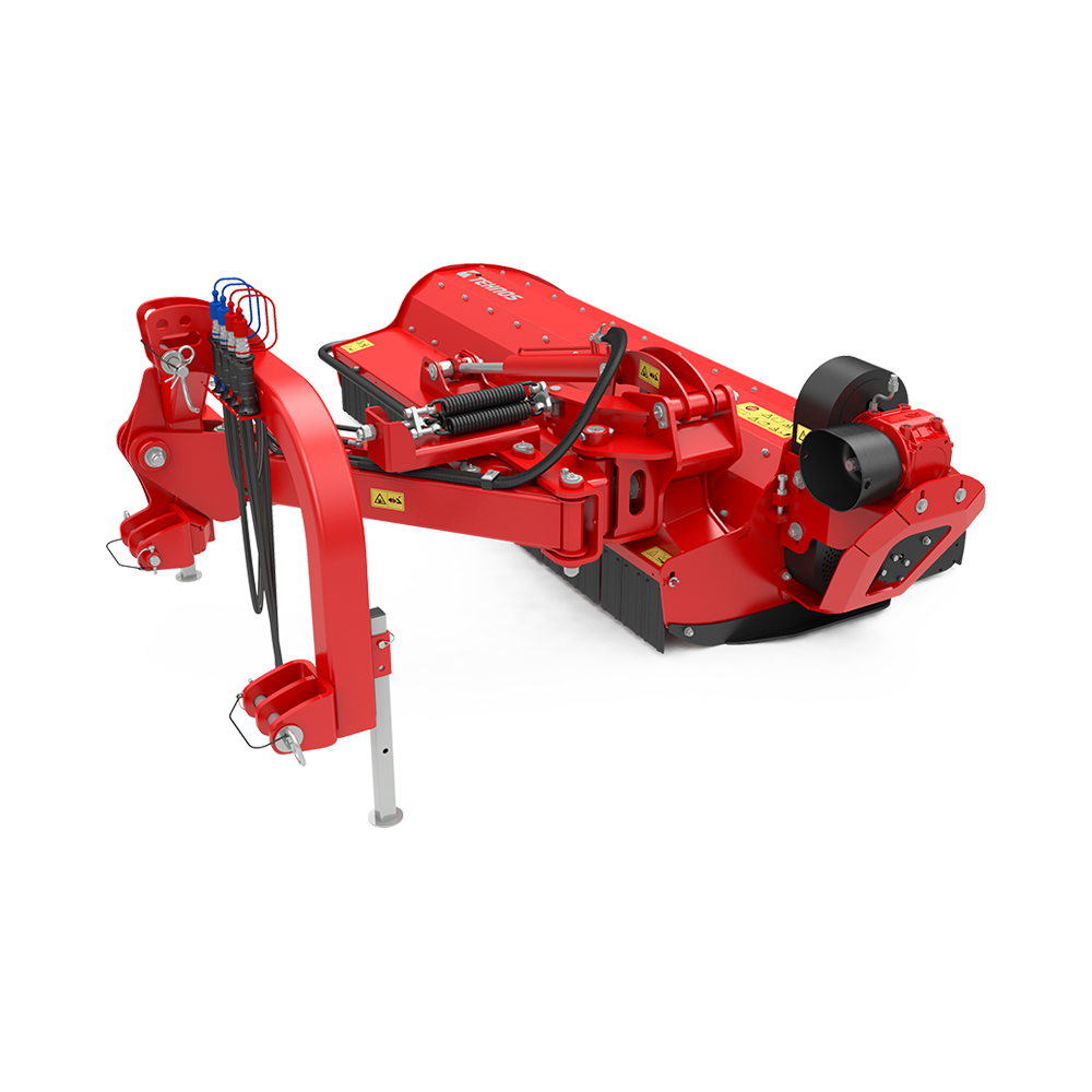 Функциональное соединение предназначено для буксировки косилки-измельчителя с молотковым аппаратом сзади и сбоку трактора с диапазоном наклона +90° вверх и -60° вниз. Косилку- измельчитель с боковым цеповым аппаратом можно подключить к тракторному трехточечному соединению II-й и III-й к атегорий. Встроенная муфта свободного хода предотвращает повреждение машины и коробки передач. Косилка-измельчитель с боковым цеповым аппаратом отличается от других универсальных косилок-измельчителей с цеповым аппаратом иным размещением коробки передач и параллелограммом, которые были разработаны для реализации горизонтального гидравлического смещения. Специальное навесное орудие с гидравлическим цилиндром предназначено для подъема/опускания навесного орудия. Несмотря на положение пластин параллелограмма при мульчировании, предохранительный механизм обеспечивает эквивалентную защиту и одновременный частичный подъeм косилки-измельчителя с цеповым аппаратом в случае еe столкновения с препятствиями.